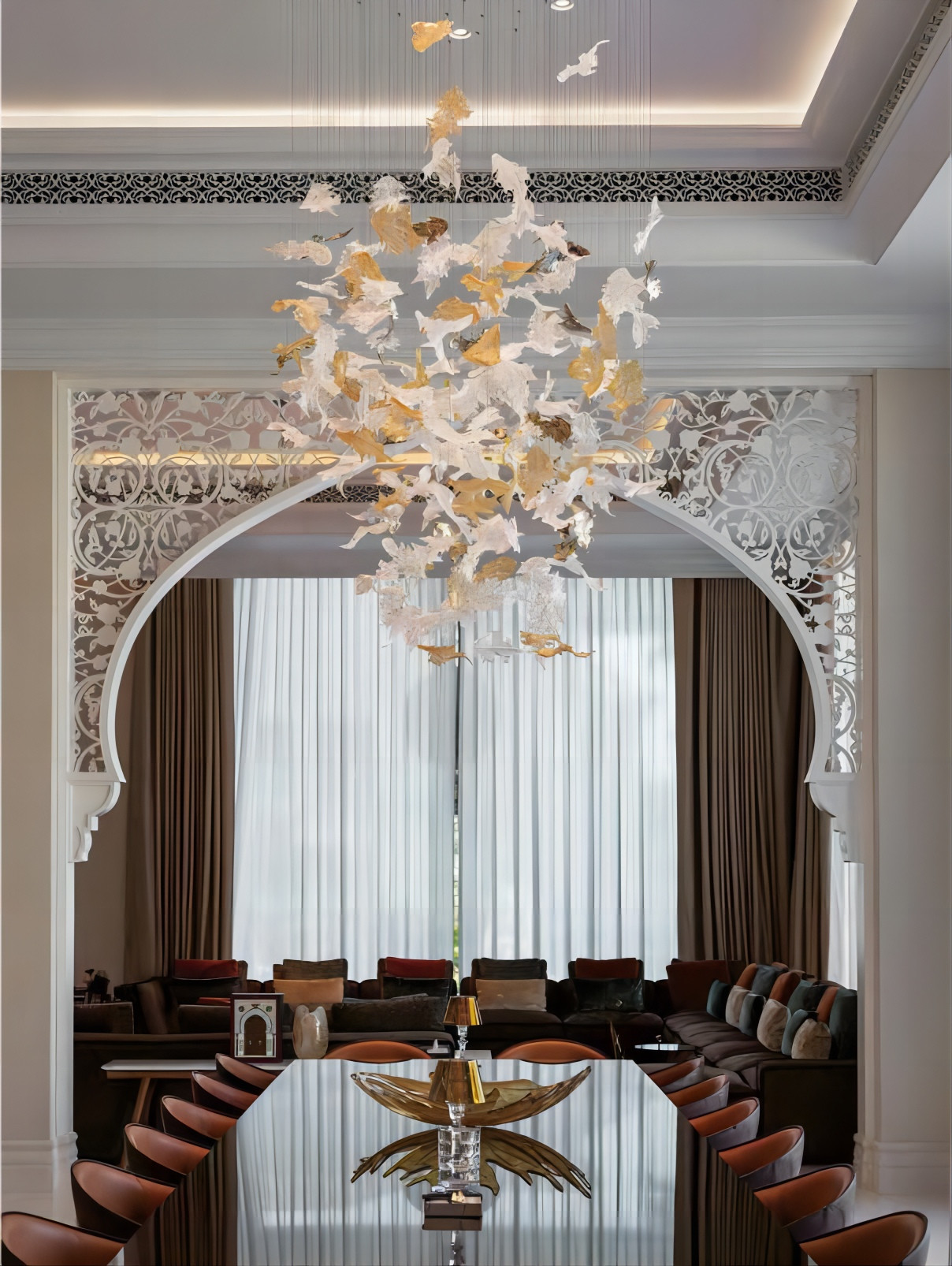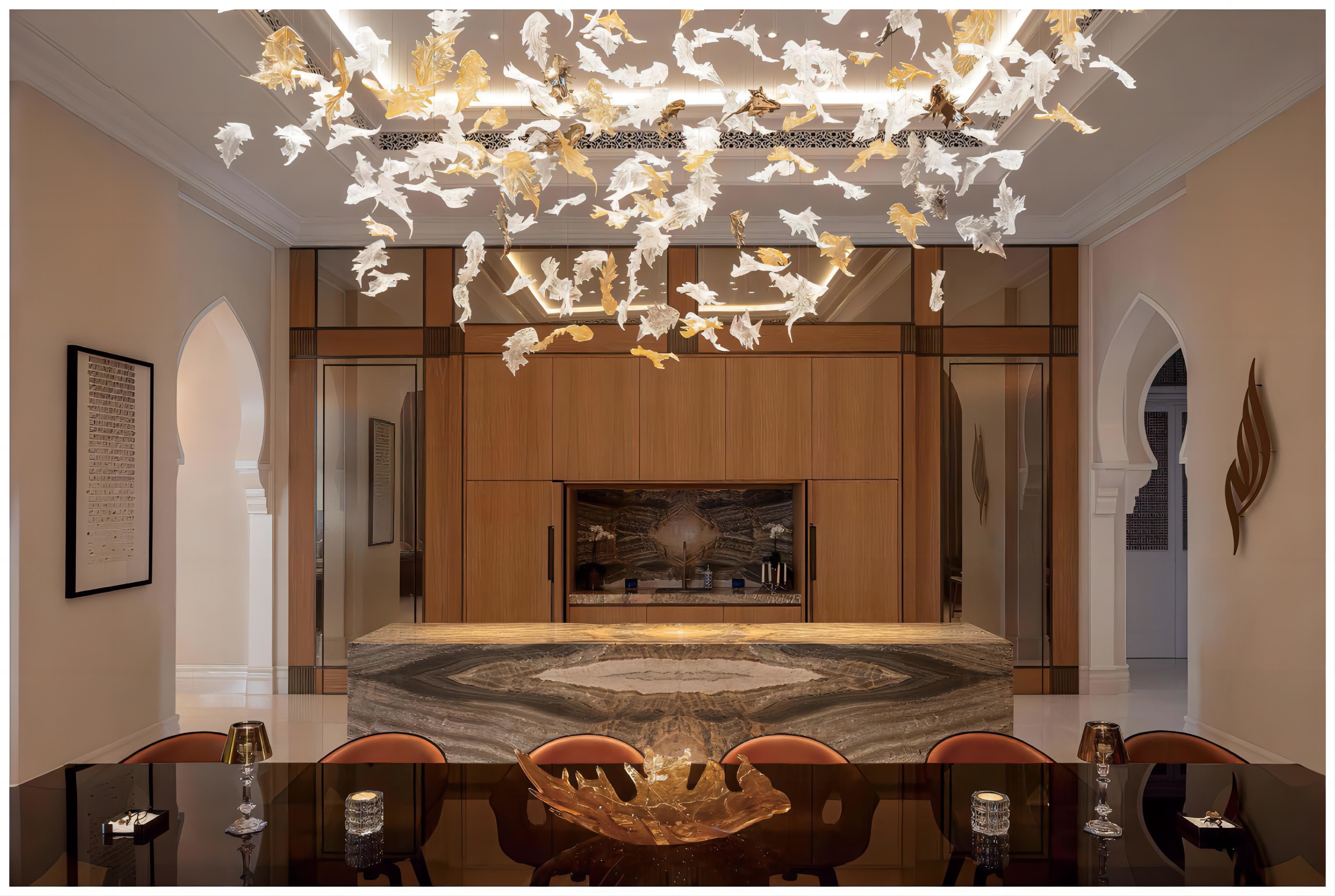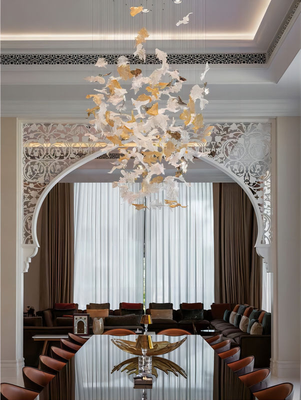 Bu özelleştirilmiş akçaağaç yaprağı avize, akçaağaç yapraklarından ilham alır ve akçaağaç yapraklarının zarafetini aydınlatmayla birleştirerek son derece sanatsal ve dekoratif bir lamba yaratır. Her bir akçaağaç yaprağı sarkıt, akçaağaç yaprağının dokusunu ve ana hatlarını gösteren, gerçeğe yakın, ince cam işçiliği ile yapılmıştır. Akçaağaç yaprağı sarkıt avizenin genel şekli zarif ve benzersizdir. Hem bir aydınlatma cihazı hem de bir sanat eseridir, ziyafet salonunun dekoratif temasına mükemmel bir şekilde entegre olur.
